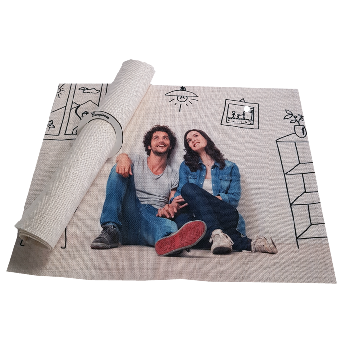 Tovaglietta colazione in tessuto simile alla juta con stampa full foto. Misura 30x40 cm ed anello MDF stampa Buongiorno