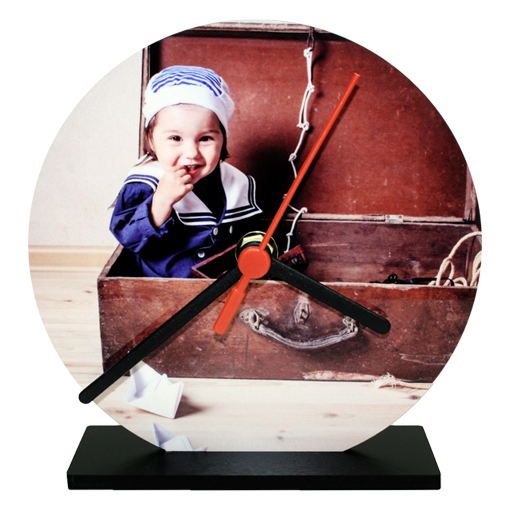 Orologio rotondo in legno MDF, spessore 6 mm con basetta d'appoggio nera. Se non presenti nel file, non verranno aggiunti i numeri delle ore. (Numeri disponibili nella sezione CLIP ART del configuratore)