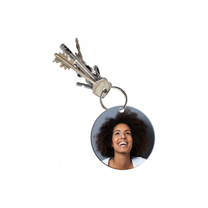 Portachiavi in plastica rotondo con stampa su un lato, retro bianco.