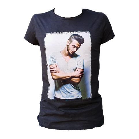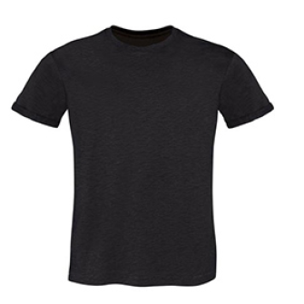 T-shirt 100% cotone da uomo colore nero con stampa 25x35. Il tessuto della maglia è stile fiammato. Filato slub per ottenere un'effetto vintage.